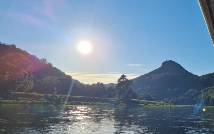 Genießen Sie das faszinierende Panorama der Sächsischen Schweiz von der Wasserperspektive aus.