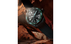 Herrenuhr Quarz, Solar, Calibre TH50.00 - eigenes Manufakturkaliber , Edelstahlgehäuse, schwarz DLC beschichtet, Durchmesser 40 mm, Leuchtindizes, schwarz-grüne einseitig drehbare Lünette aus Karbon mit SuperLuminova, schwarzes Zifferblatt mit horizontalen Streifen, unsichtbares Solarpanel, Kautschukband, , entspiegeltes Saphirglas, verschraubter Edelstahlboden mit Windrosen-Motiv, 20 bar (200m) wasserdicht