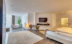 Unser Private SPA mit eigener Sauna, Yin Yang Duo Klangwellenbadewanne mit vitalisierenden Farblicht und dem großen Wasserbett bietet luxuriöse Wellnesserlebnisse für Zwei.